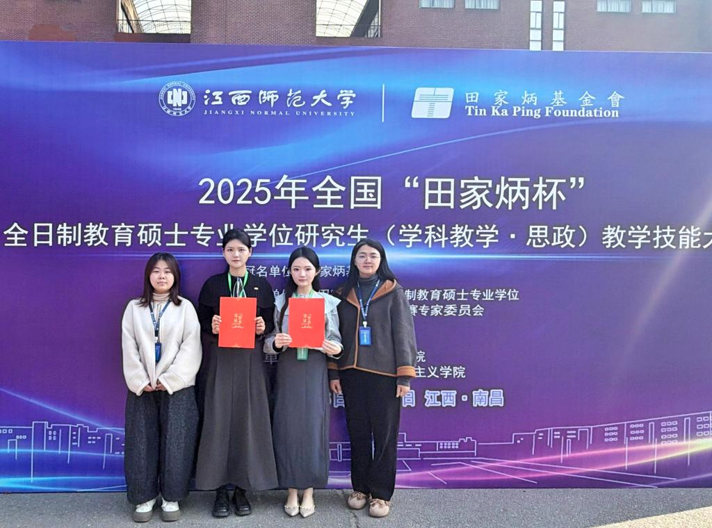 12月5日至7日,2025年全国“田家炳杯”全日制教育硕士专业学位研究生(学科教学·思政)教学技能大赛决赛在江西师范大学圆满落幕。我院选派的2023级硕士研究生陈苗、王晓婷,凭借扎实的专业功底和出色的教学能力,双双荣获三等奖,充分彰显了我院在思政教育人才培养领域的扎实成效。
