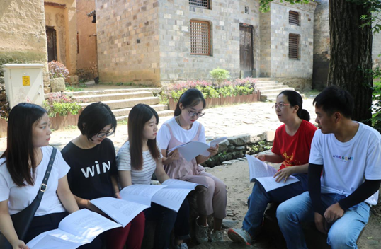 西河古村是新县“英雄梦.新县梦”重要规划之一,并入选第十四届中国景观村落。古村依河而建,山环水抱,建筑工艺精湛,与周围自然环境紧密结合,山、水和田园风光相得益彰,是豫南古村落的典型代表。村落文化底蕴丰富,人文气息深厚,体现出新县用红色精神实现“可持续、更文明、更幸福”的绿色发展理念。同学们在悠闲惬意的环境之中,不忘此行主要目的,在“红军树”下进行“习近平金句研学”的交流学习。