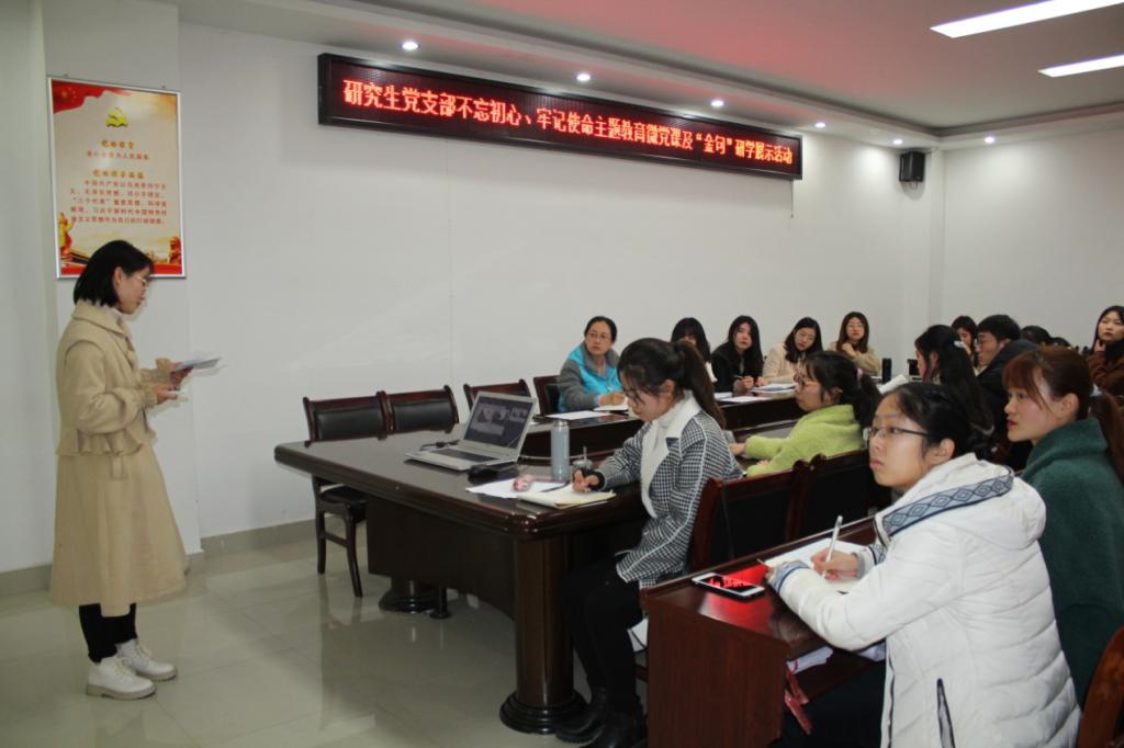为进一步推动“不忘初心,牢记使命”主题教育深入开展,12月2日晚,研究生党支部围绕主题教育,组织开展了微党课展示活动,支部党员、入党积极分子踊跃参加。活动由支部书记卢云晓主持。