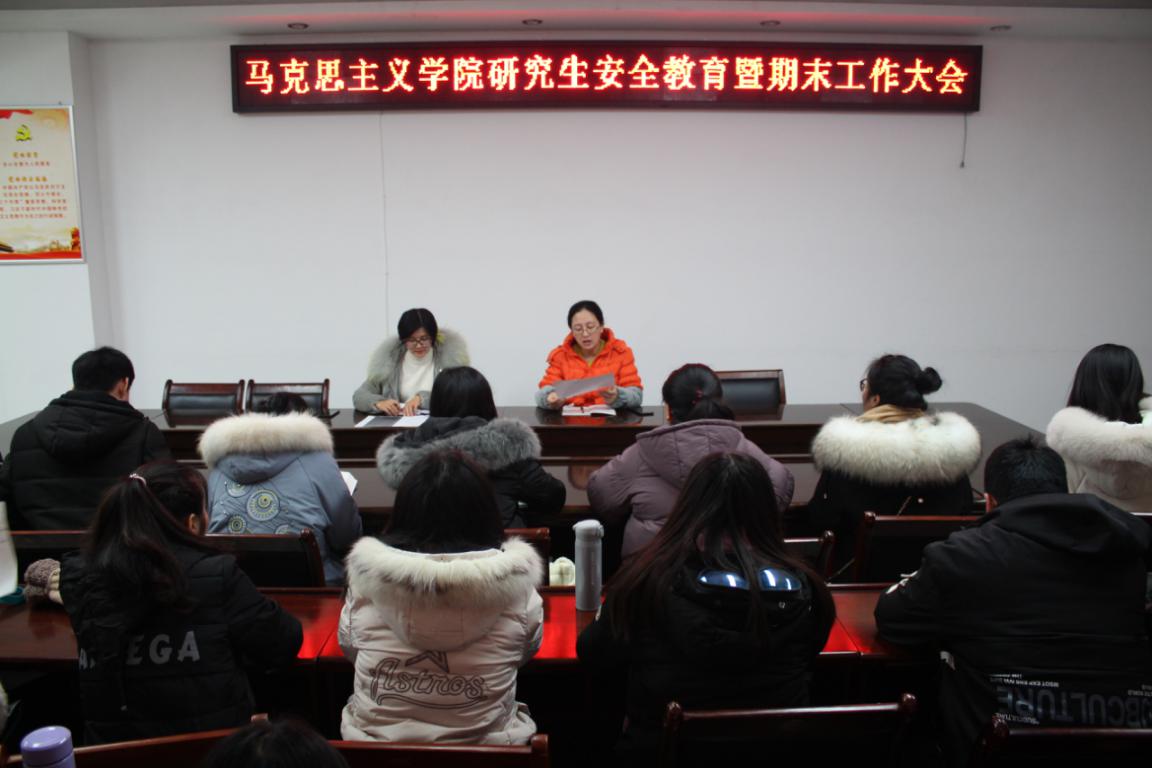 2019年12月25日,为加强研究生安全防范意识,自觉遵守校规校纪考纪,我院在323会议室召开关于安全教育以及期末工作的会议,研究生教学秘书卢云晓和班主任郑晨霞及全体研究生参加了此次会议。