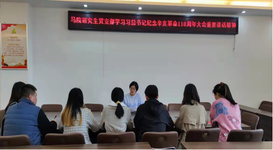 为深入学习贯彻习近平总书记纪念辛亥革命110周年大会重要讲话精神。10月19日,我院研究生党支部在社科楼323会议室开展学习习近平总书记纪念辛亥革命110周年大会重要讲话精神会议,研究生党支部全体成员参加,会议由支部书记郑晨霞主持。