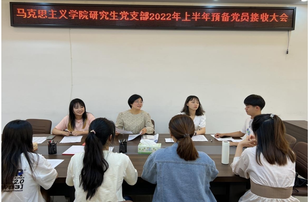 5月31日,我院研究生党支部于社科楼323会议室召开2022年上半年预备党员接收大会,讨论了余欢欢、张蒙蒙、赵子剑、赵婧同、陶小颍、郭婉如、 喻泳成、葛鸿萍八位同志转为中共预备党员的问题。会议由支部书记郑晨霞同志主持,彭燕担任监票人,王澳远担任计票人。