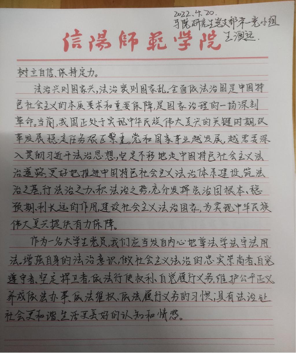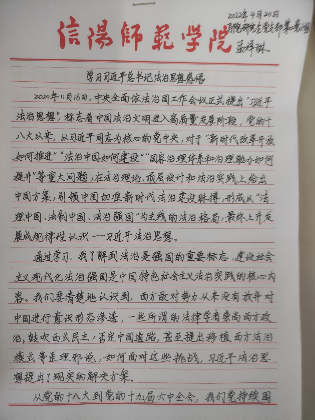 为深入学习贯彻习近平法治思想,增强我院研究生党员的政治素养和法治意识,我院研究生党支部开展了习近平法治思想学习交流主题党日活动。我院研究生党员、预备党员及发展对象积极参与,充分运用互联网等多渠道展开学习,通过观看相关法治宣传片、系统学习习近平法治思想,进一步增强法治意识和思想觉悟。大家根据学习情况,结合自身实际,认真撰写学习习近平法治思想的心得感悟,以下为部分同志撰写的心得感悟图片。