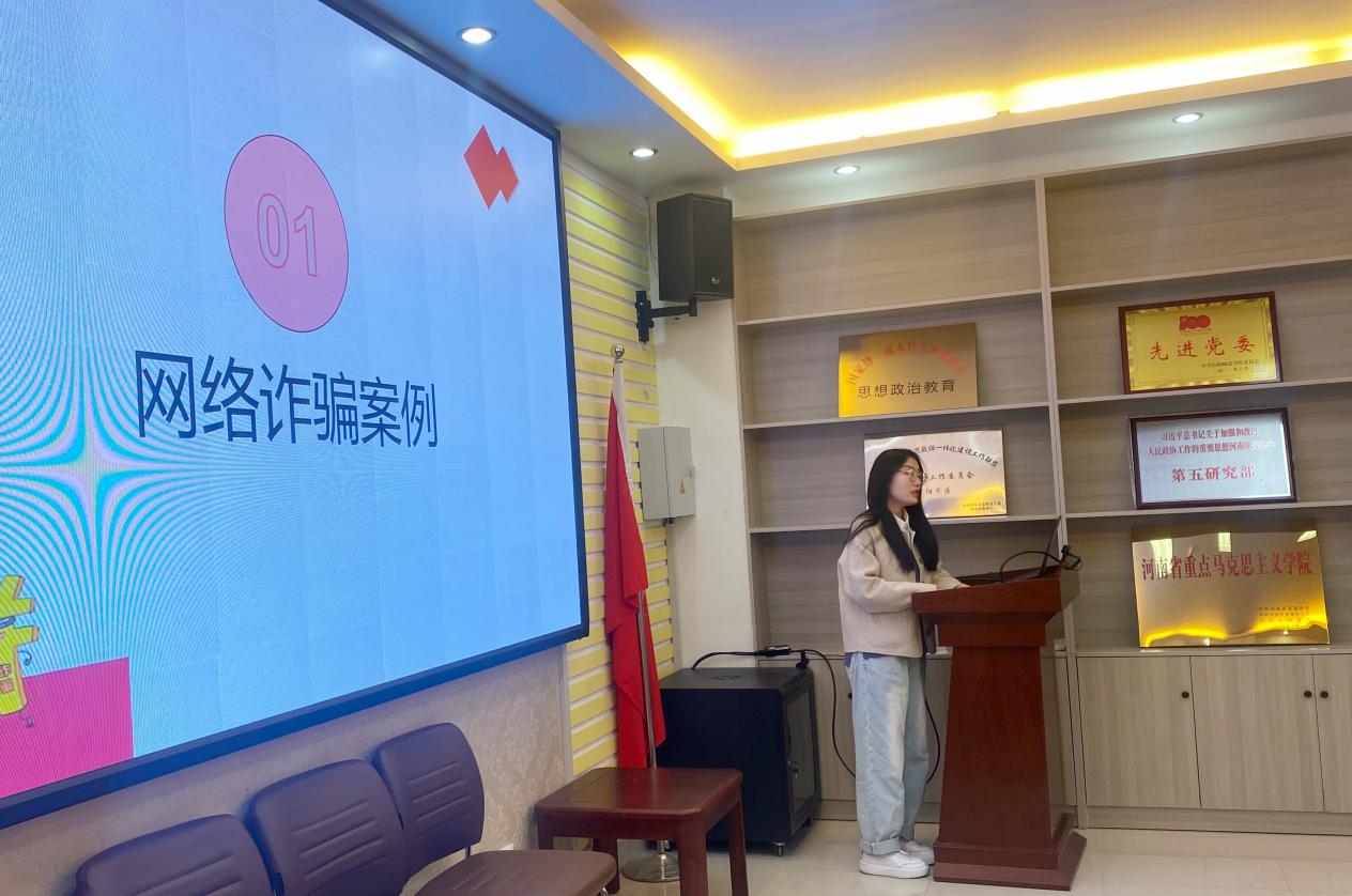 2022级专硕班夏萌萌、杨少晗两位同学作为学生代表,分别就心理健康、诈骗防范做了专业的知识科普,借助案例使同学们更深刻地了解了心理健康问题和网络诈骗陷阱,有了较强的警醒意识。