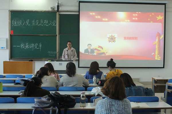 为引导党员发展对象学习党章、尊崇党章和践行党章,牢固树立党章意识,进一步做到思想入党,积极营造“人人学习党章、人人尊崇党章”的良好氛围,4月8日下午,我院第29期党员发展对象在社科楼515教室开展了“组织入党 首先思想入党--我要讲党章”活动。活动由本期党员发展对象组长徐豫资主持。