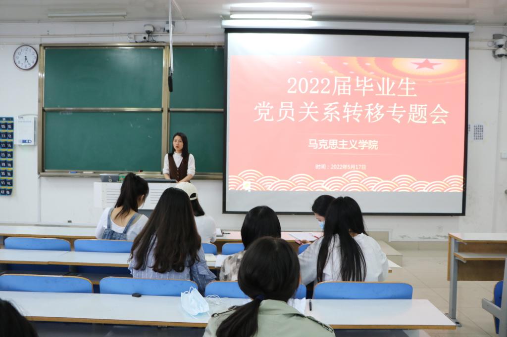 会上,任婷强调了毕业生党员关系转移工作的重要性并指出,各位毕业生党员应熟悉党员组织关系转移的相关环节,理顺党员关系转移的相关流程。杨璐详细地讲解了三类毕业生党员的党员组织关系的对应去向,并强调注意事项。随后,任婷与杨璐对部分毕业生党员提出的疑问做出有效解答。最后,任婷对2022届本科、研究生毕业生党员提出两点要求:一要守好党员初心,铭记党员身份,牢记入党誓词,发挥党员的先锋模范作用,展现青年党员良好的精神面貌。二要有担当意识,担当党员使命,牢记党的嘱托,把美好的青春奉献给我国社会主义现代化的建设,助力实现中华民族伟大复兴的中国梦。