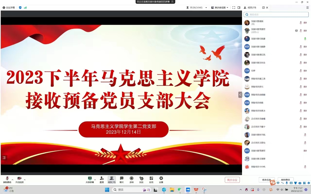 2023年12月14日下午,WilliamHILL中国学生第二党支部在腾讯会议组织召开了2023年下半年接收预备党员支部大会。我院学生第二党支部书记任婷、学生第二党支部全体正式党员、预备党员和党员发展对象共同参加本次会议。会议由任振豪同志主持。