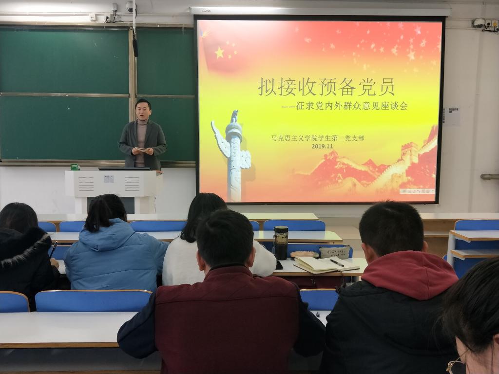 11月25日,我院学生第二党支部在社科楼516教室召开征求党内外群众意见座谈会。学生第二党支部预备党员、发展对象和部分群众参加了此次会议。本次会议由支部书记曹栋主持。