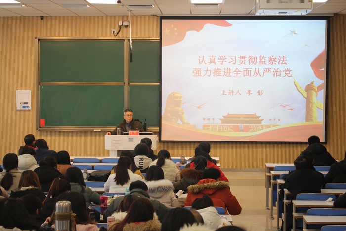 宣讲会上,李彤用通俗、朴实的语言,从反腐新形势论断、深入学习《监察法》、《监察法》相关法律条文学习三个部分展开系统论述。首先,李彤结合近些年查办案件的相关数据统计指出,十八大以来我国“打虎拍蝇”反腐败已经形成压倒性态势,但当前反腐任务依然艰巨,仍需加大监察力度,严惩腐败。接着,他结合经典案例从《监察法》出台的历史和现实背景、基本原则、重点条文以及常见犯罪立案处罚标准等方面深入解读了《监察法》。解读的不仅仅是《监察法》相关知识,而且还是一次深刻的党课。最后,李彤带领大家学习了《监察法》相关法律条文。他表示,在以后的学习与工作中,党员干部要进一步增强纪律意识、法治意识、规矩意识,严于律己,牢固三条防线。唐国战对本次宣讲会做出总结,他指出,本次报告整体上视野开阔、信息量大,案例典型新颖,既有理论的高度,又有实践的深度。既有学术上的严谨,又有解读上的通俗,既是党纪法规知识的普及,也是党风廉政建设的生动党课,是一次有高度、有温度、接地气的高水平报告。