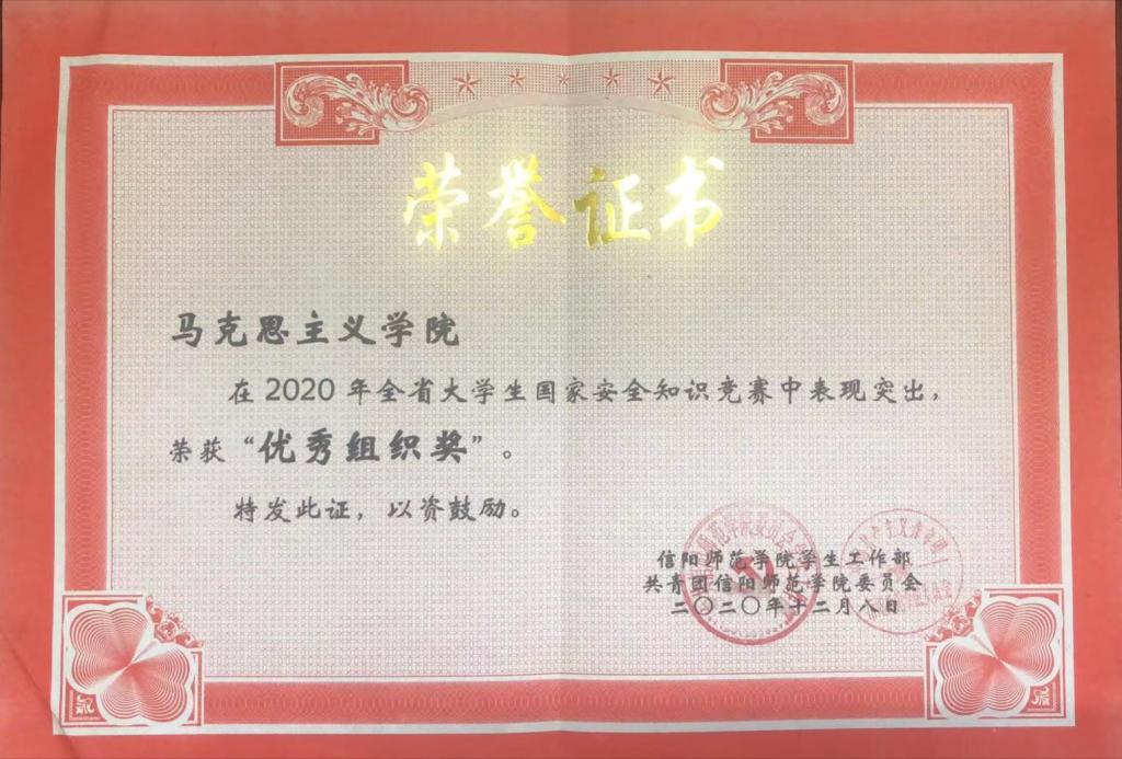 经信阳师范学院学生工作部以及共青团信阳师范学院委员会考核审定,我院在学校举办的2020年全省大学生国家安全知识竞赛中积极参与、表现突出,荣获“优秀组织奖”。