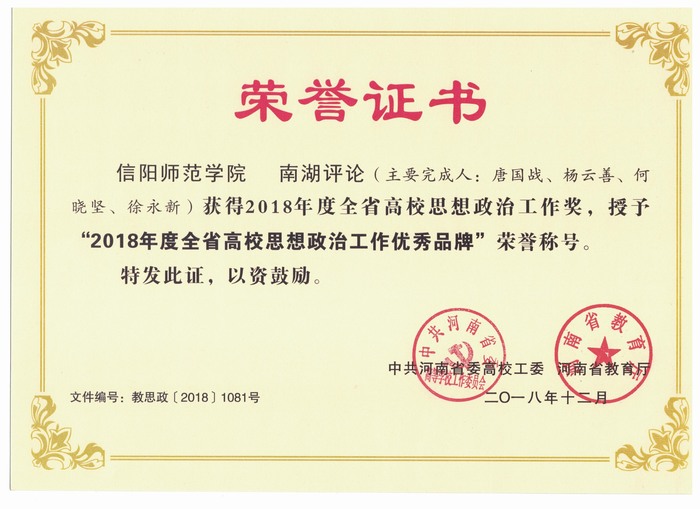 近日,河南省教育厅公布了2018年度全省高校思想政治工作优秀品牌名单,我院申报的《南湖评论》获批,我校共获批4项。