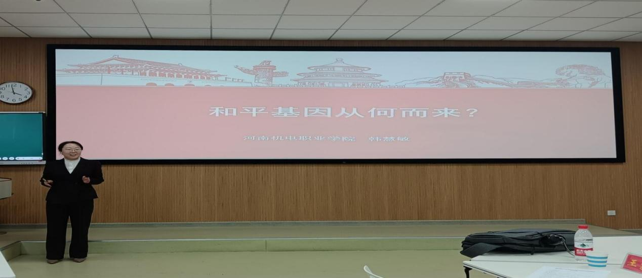 第三届全国高校思想政治理论课教学展示活动特等奖和河南省高校思想政治理论课教学技能‘大比武’综合素质和教学展示特等奖获得者,河南机电职业学院“习近平新时代中国特色社会主义思想概论”教研室主任韩慧敏作“习近平新时代中国特色社会主义思想”课第十六章第二节第一目“和平基因从何而来”教学展示。