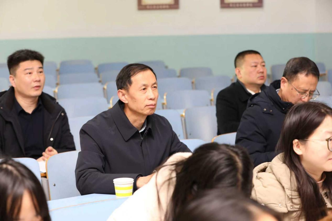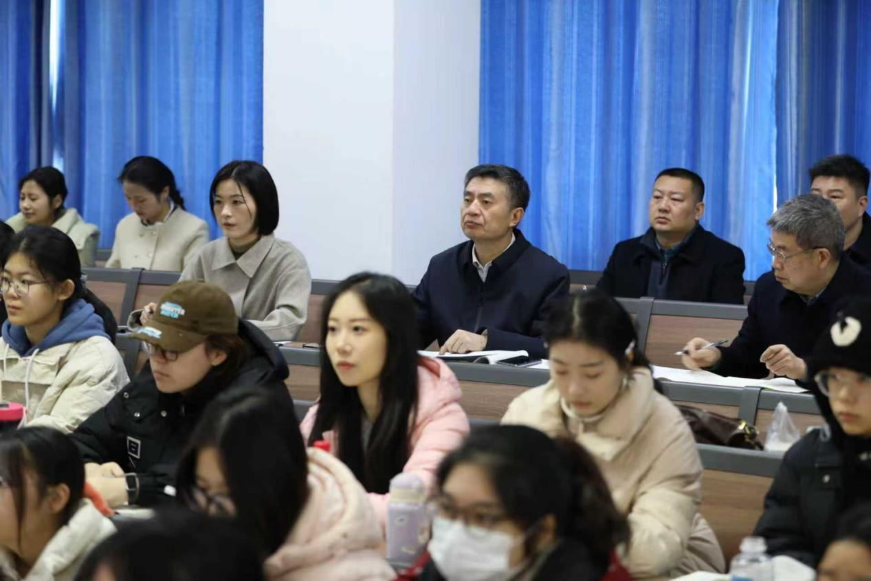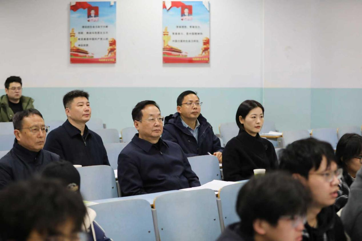 12月11日上午,在教六楼102教室,涂友超听取了齐传洁老师讲授的《习近平新时代中国特色社会主义思想概论》“建设社会主义生态文明”专题。涂友超肯定了课程紧扣时代脉搏、方法灵活创新的特点,强调要持续推动党的创新理论与学生思想实际、时代发展大势深度契合。