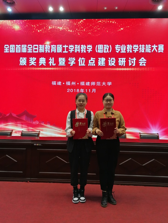 11月21日—23日,由全国教育专业学位研究生教育指导委员会主办的全国首届全日制教育硕士学科教学(思政)专业教学技能大赛(决赛)在福建师范大学举行。经过激烈的角逐,我院2017级学科教学(思政)专业研究生张梦瑶和罗尚泽两位同学双双荣获三等奖。