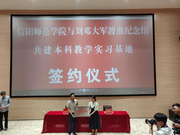 基地签约与挂牌仪式由息县副处级干部王金利主持。签约仪式上,息县县委常委、宣传部部长李学超致欢迎词,我院院长杨云善作了热情洋溢的讲话。随后,杨云善、李学超代表双方就信阳师范学院与刘邓大军渡淮纪念馆共建本科教学实习基地正式签约,并由我院院长杨云善和刘邓大军渡淮纪念馆馆长孙艳共同揭牌。