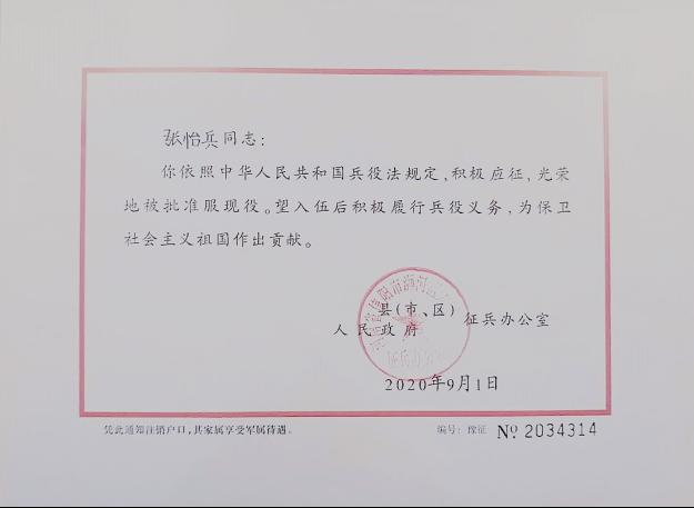 保家卫国终无悔,绿色军营献青春。2020年9月1日,WilliamHILL中国张怡兵同学收到河南省人民政府征兵办公室印发的入伍通知书,光荣参军入伍,实现我院征兵工作的“零”突破。