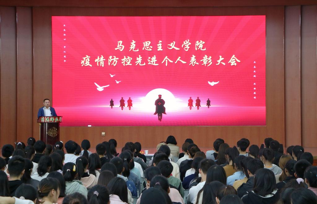会议伊始,同学们一同观看“全民抗疫”视频短片,回顾了春节前夕那场突如其来的的新冠肺炎疫情。视频突出展示我院学子积极参加抗击疫情志愿服务活动,为抗击疫情奉献自己的青春力量。随后,何晓坚发表讲话,他对在抗击疫情做出贡献的同学提出表扬,希望同学们不惧风雨,勇挑重任,继续发扬志愿服务精神。同时,他强调,当前疫情防控工作尚未完成,同学们要时刻注意公共卫生安全,严格遵守校规校纪,把精力投入到学习中。接着,疫情防控先进个人代表刘婕以及积极参与校外疫情防控学生代表姚佳慧依次上台发言。她们回顾了自己在疫情中的志愿服务活动,并呼吁同学们要继续发扬抗疫精神,坚定理想信念,勇担时代责任。最后,何晓坚、曹菁菁为疫情防控先进个人颁奖并合影留念。