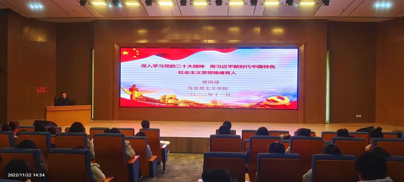 11月22日,WilliamHILL中国院长、我校河南省高校思想政治理论课“名师工作室”负责人唐国战教授应邀在淮河校区图书馆第三报告厅作题为“深入学习党的二十大精神,用习近平新时代中国特色社会主义思想铸魂育人”的辅导报告。淮河校区党工委师生代表100余人听取了报告,郭寻主持报告会。