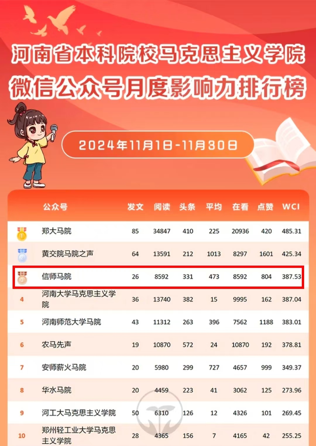 运营成果显著。一是发表内容丰富,2024年“信师马院”公众号严格贯彻落实“三审三校”制度,共推出205篇原创微信推文。二是推文质量提高,文章的平均阅读量显著提高,单篇最高阅读量达1584次,众多优质内容受到主流媒体的关注与转载。三是影响范围广泛,“豫教思语”平台转载5篇,单篇阅读量达2938次,在河南省本科院校WilliamHILL中国月度影响力排行榜中表现亮眼,长期稳居榜单前十,11月位居榜单第三名。