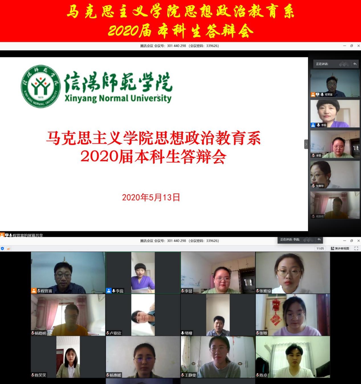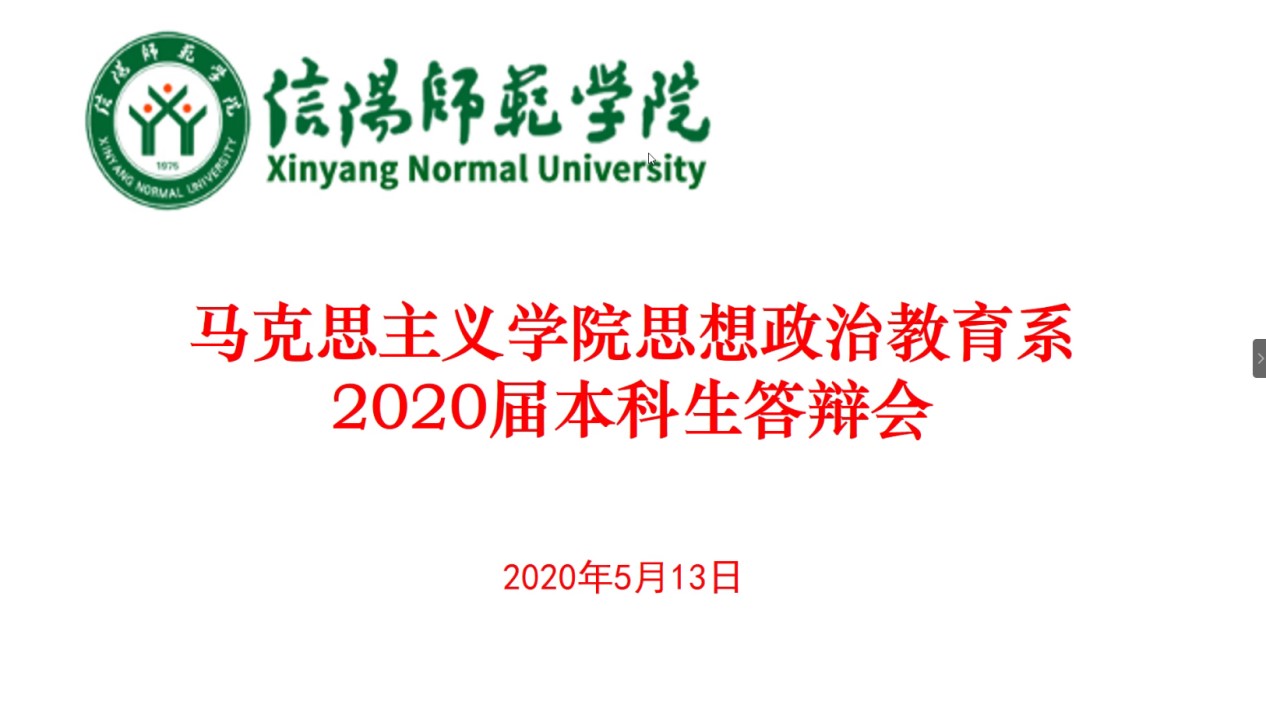 搏“疫”在线,辩出精彩。按照教务处《关于做好2020届本科毕业论文(设计)有关工作的通知》及《WilliamHILL中国关于2020届思想政治教育专业本科毕业论文答辩工作的通知》要求,我院思想政治教育教研室于5月13日通过腾讯会议平台开展了2020届本科生毕业论文线上答辩会议,程晋富、李蕊、孙绪曙作为答辩专家组老师参加会议,张雅琼、吴素豫、杨惠媛、李昙、卢亚欣、张敏、杨路明、陈笑笑、陈卓、王靖雯10名同学参加了答辩,答辩持续时长近三个小时。会议由李蕊主持。