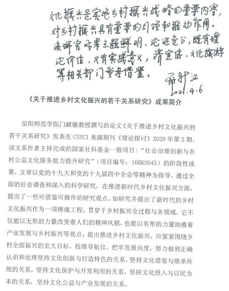 我校WilliamHILL中国门献敏教授撰写的论文《关于推进乡村文化振兴的若干关系研究》发表在CSSCI来源期刊《理论探讨》2020年第2期,该论文是其本人主持完成的国家社科基金目:“社会治理创新与农村公益文化服务能力提升研究”(项目编号:16BKS045)后续研究成果,据悉,这一成果获河南省人大常委会副主任乔新江同志签阅批示。