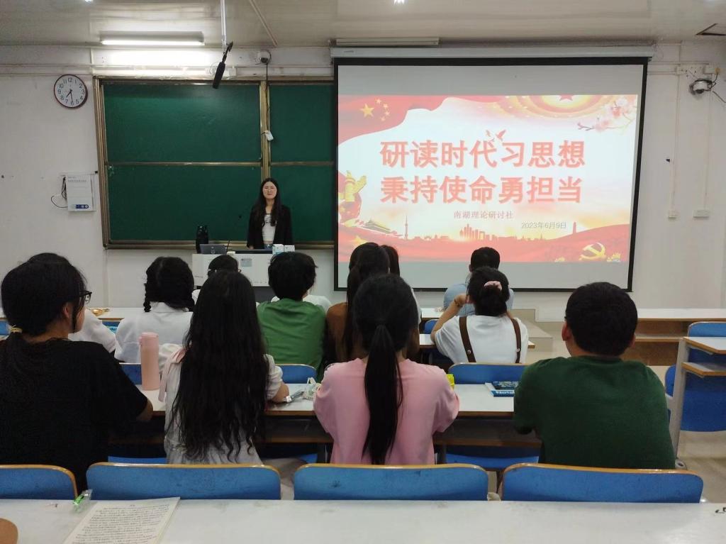 为深入学习贯彻习近平新时代中国特色社会主义思想,引导社团成员筑牢理想信念,勇担时代使命,6月9日晚,南湖理论研讨社在社科楼514教室举办“研读时代习思想,秉持使命勇担当”主题团课。团课由团支书武文雪主持,全体社团成员共同参加。