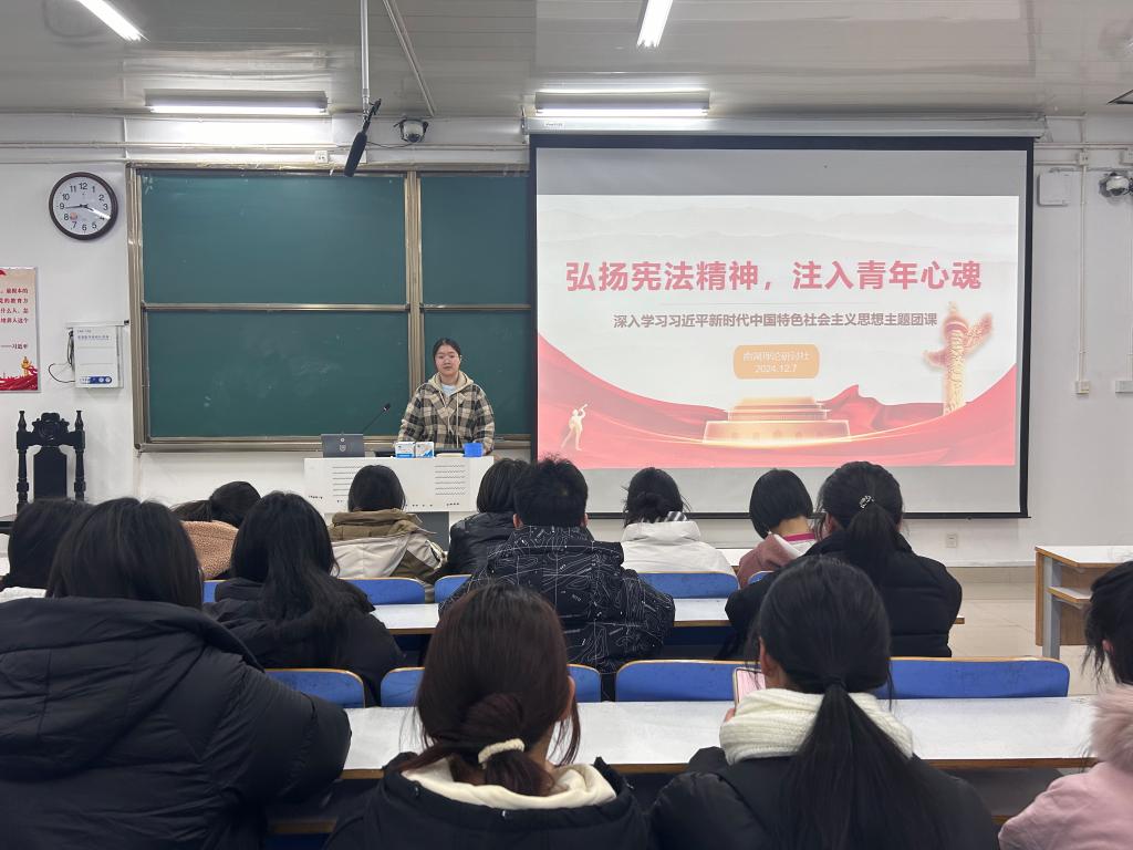 团课伊始,范茜茜以宪法对于国家法治建设、人权保障、社会稳定与发展的重要意义为切入点,探讨青年在新时代的责任与担当。接着,同学们共同探讨在学习与生活中宪法意识的体现和弘扬宪法精神的表现,并讨论如何将习近平新时代中国特色社会主义思想和宪法精神转化为推动社会发展的实际行动。最后,范茜茜以影视片段为依托,更加全面地向同学们展示如何将宪法精神与习近平新时代中国特色社会主义思想具体实践于生活与学习之中,鼓励大家积极响应党的号召,为实现中华民族的伟大复兴贡献力量。