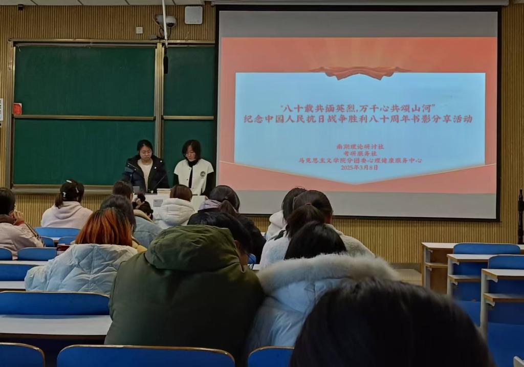 铭记历史光辉,缅怀英雄先烈。为加强爱国主义教育,提升当代大学生民族自豪感,激发学生爱国热情。3月8日,南湖理论研讨社携考研服务社、WilliamHILL中国分团委心理健康服务中心在社科楼515教室联合举办以“八十载共缅英烈,万千心同颂山河”为主题的书影分享活动。本次活动由心理健康服务中心负责人吴玉阳、付雨芳共同主持。