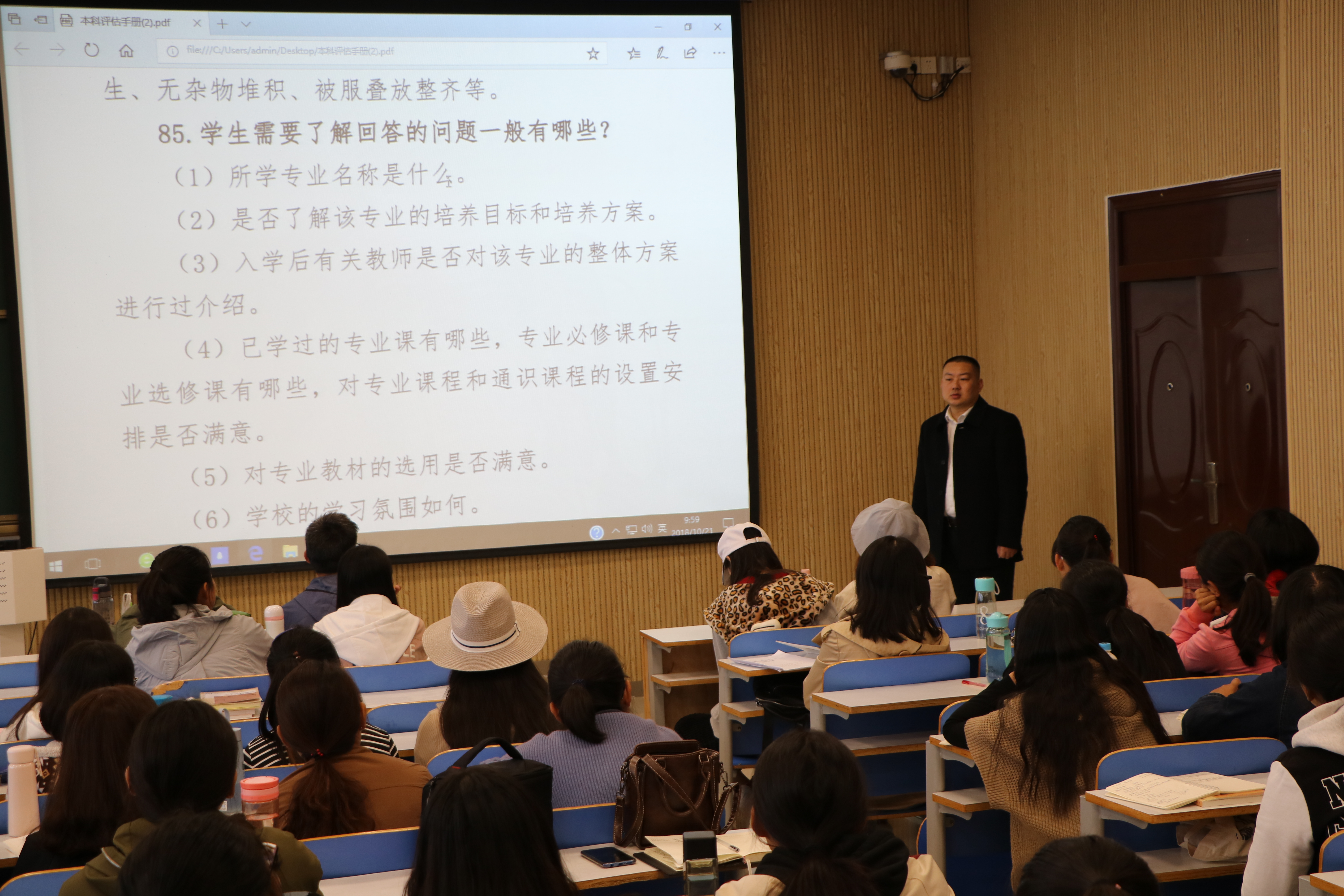 会上,各班级负责人从审核评估的基本知识、校史校情和评建工作三个方面带领大家认真学习有关文件。接着,他们详细介绍了我院院情院风,带领大家重点学习了我院的基本概况、专业建设以及学生培养方向。学习过程中,党委副书记何晓坚对大家提出要求。他希望同学们时刻关注评估工作,以主人翁的姿态积极参与评估活动。学习期间,学生会主席团和班级负责人不定时对我院学生进行抽查,同学们积极作答,学习热情高涨。21日晚,我院在社科楼514、516教室组织部分学生进行了评估知识考试。