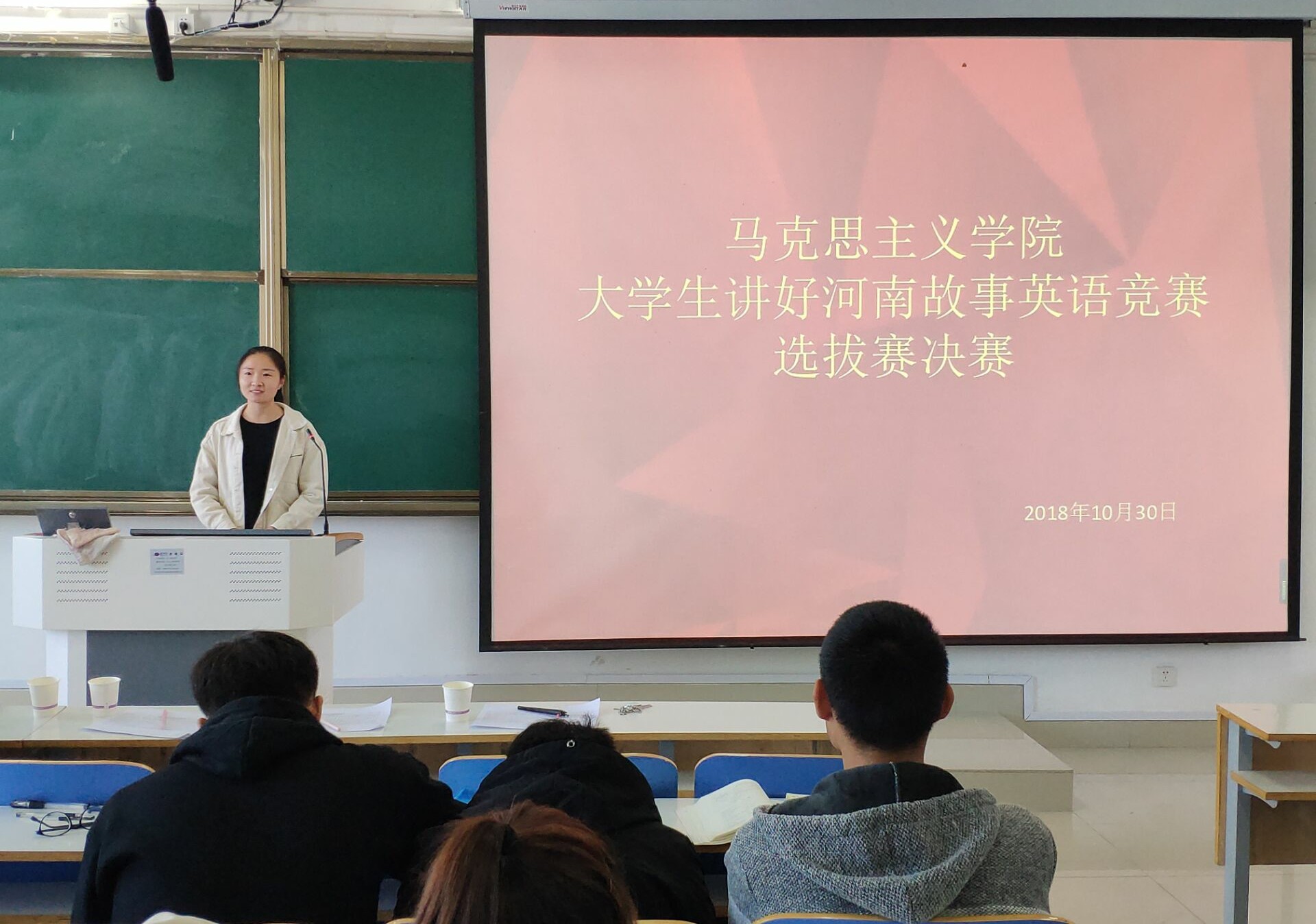为鼓励在校大学生利用英语宣讲河南,传播好新时代河南声音,10月30日上午,WilliamHILL中国在社科楼514教室开展“大学生讲好河南故事英语竞赛选拔赛”决赛。科研秘书常文涛、团委老师曹菁菁及2018级全体学生共同观看此次比赛。比赛由南湖理论研讨社社长张静主持。