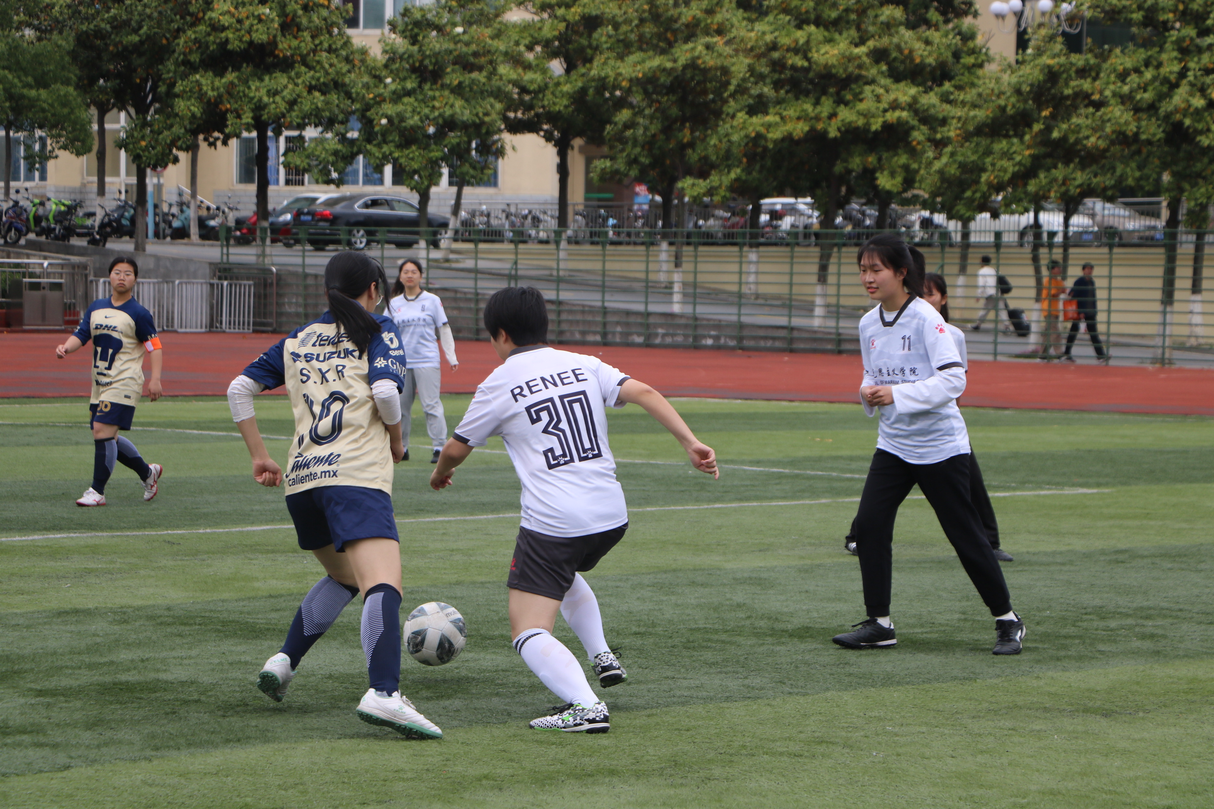 比赛开始前,我院球员开展赛前热身活动,教练对其进行战术指导和布置,嘱咐球员全力以赴,赛出风采。随着裁判的一声哨响,比赛正式开始,参赛队员迅速进入状态。上半场比赛时,我院球员先发制人,猛烈进攻,通过巧妙的传球和默契的配合赢得在场观众的阵阵喝彩。我院30号球员李木瑶反应机敏,在关键时刻凭借精湛的球技迅速突袭至对方禁区,在禁区内临门一脚,足球应声入网,成功拿下全场第一分,极大的鼓舞了我方士气。随后,我院球员严防死守,在上半场比赛中再进一球,以两分的优势结束上半场比赛。中场休息时,我院球员重新调整战略队形,为下半场比赛做好充分准备。下半场比赛时,赛场气氛愈加激烈,我院队员精神饱满、攻势不减,在喝彩声中主动出击,依靠完美的配合和矫健的身手,突破对方防守再进一球,牢牢掌握了比赛节奏。最后,我院女子足球队以3:1的比分战胜商学院,获得本次比赛的胜利。