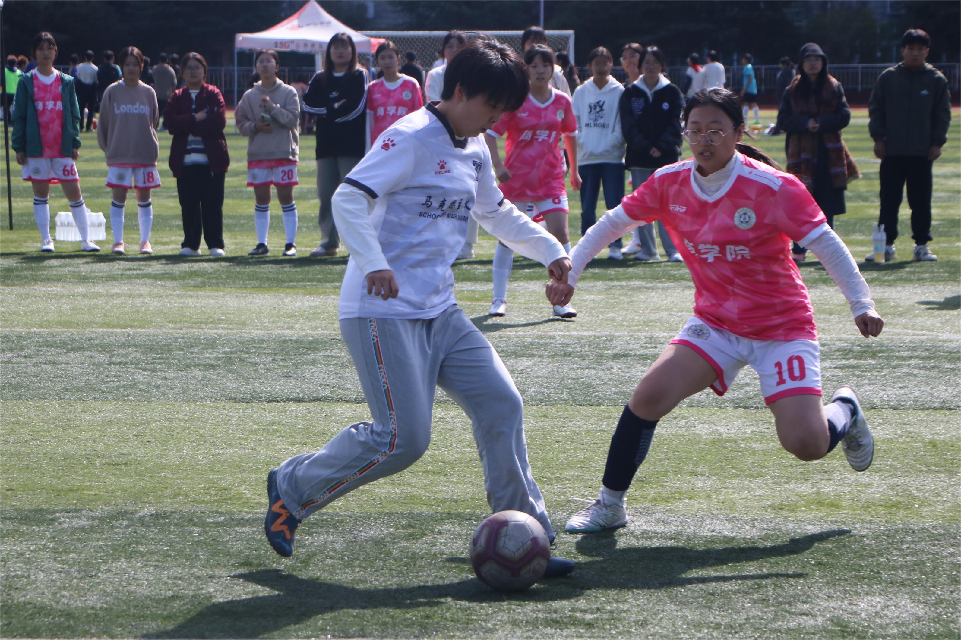 赛前,我院球员有序开展热身训练,积极备战,蓄势待发。随着裁判的一声哨响,比赛正式开始,双方球员迅速进入比赛状态。上半场比赛中,双方球员实力不相上下,竞争激烈,但我院球员毫不示弱,积极抢拼。其中,30号球员李木瑶凭借娴熟的脚法获得绝佳机会,开进一球,极大鼓舞了球队士气。其他球员趁势出击,凭借默契的配合、巧妙的运球、熟练的脚法在上半场比赛中取得了3:1的成绩。比赛过半,进行中场休息,双方队员大汗淋漓但仍严阵以待,双方队长积极进行下半场战术安排和人员调整。下半场酣战中,商学院球员攻势迅猛,我院球员积极防守。球员们你拼我抢、你来我往,比赛很快进入白热化阶段,场上队员激情澎湃,比赛紧张而刺激。22球员杨如凤以惊人的爆发力踢开一球,成功防守,全场欢呼震耳。最终我院女足球队在凌厉攻势与巧妙配合下使局势稳定,以3:2的成绩战胜商学院代表队取得胜利。