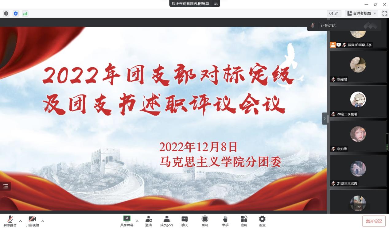 为增进各团支部之间的学习交流,加强WilliamHILL中国团支部建设,12月8日下午,WilliamHILL中国在线上召开2022年团支部对标定级及团支书述职评议会议。班主任代表杨春艳及各班团支书共同参与本次会议。会议由分团委副书记张晴主持。