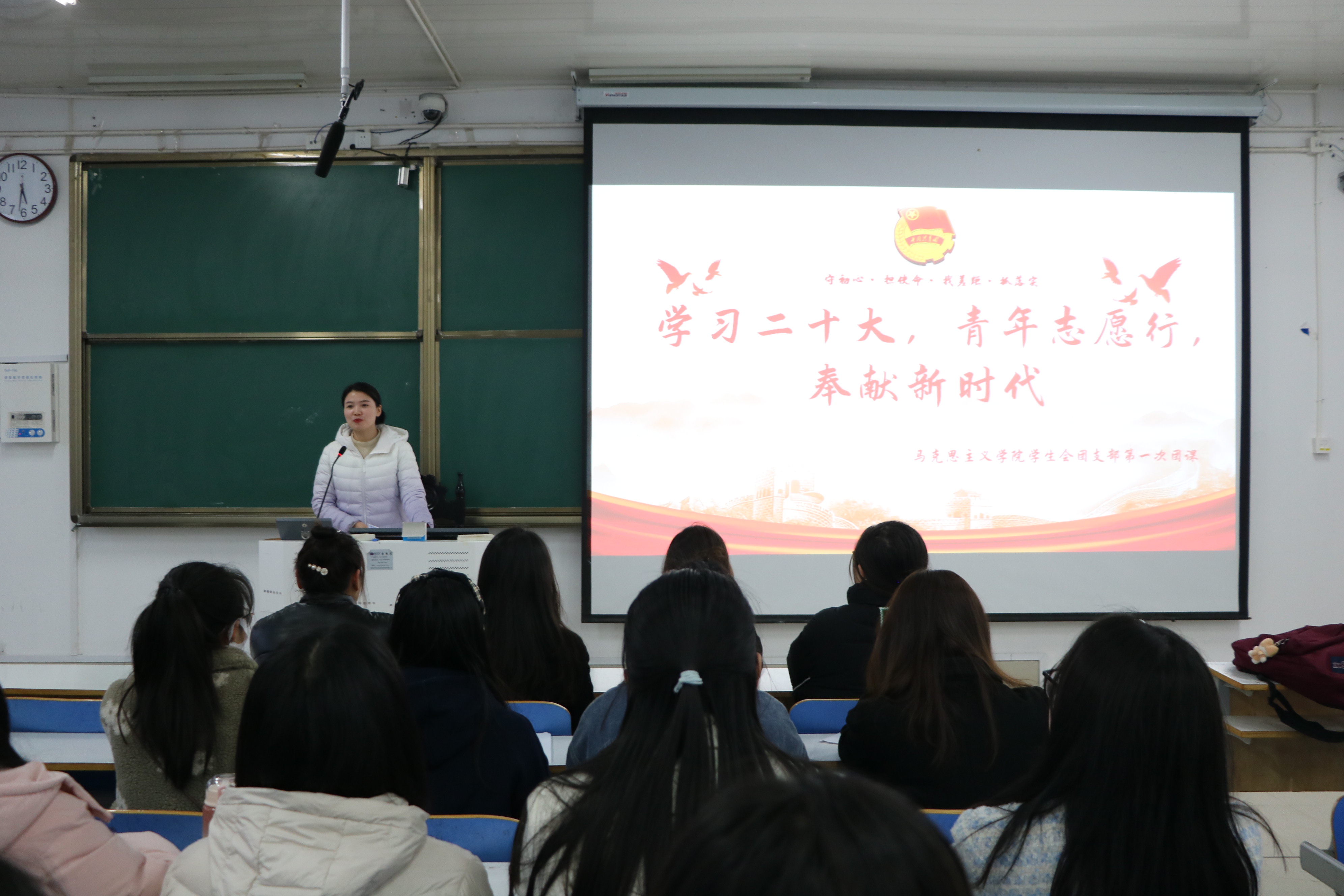 团课伊始,陶青青以党的二十大主题为切入点,全面剖析二十大主题的深邃内涵,引出青年参与志愿活动的重要性,并点明弘扬志愿精神对个人、社会和国家具有深远意义。随后,陶青青重点分析党的二十大报告中提出的“用青年志愿服务提高全社会文明程度”的重要论述,指出青年肩负着以实际行动推动伟大中国梦的实现的重要使命,应立足新时代,展现新作为,弘扬奉献、友爱、互助、进步的志愿精神,以团结奋斗、无私奉献的责任意识奏响时代最强音。最后,陶青青作总结性讲话,热切叮嘱学生会团支部成员们要坚持专业理论与社会实践相结合,积极开展和参与文明实践志愿服务活动,从中获得实践体验和自我教育,不断提高思想道德和素质能力,致力于将自己培养成专业精的专才、视野宽的通才、政治强的人才。会后,陶青青与我院学生会团支部全体成员合影留念。
