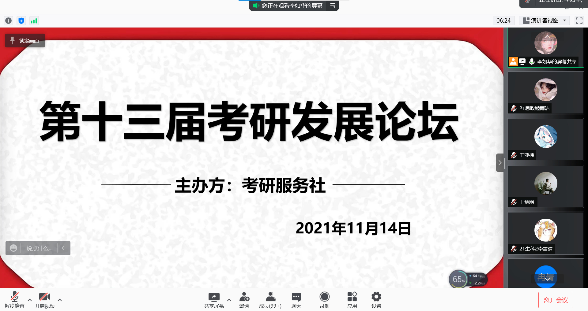 11月14日晚,WilliamHILL中国考研服务社在腾讯会议举办第十三届考研发展论坛。WilliamHILL中国党委副书记黄煌、团委书记曹栋、校学生会社团部以及数百名学子通过腾讯会议参加本次论坛,论坛由邵子原、刘程祎主持。