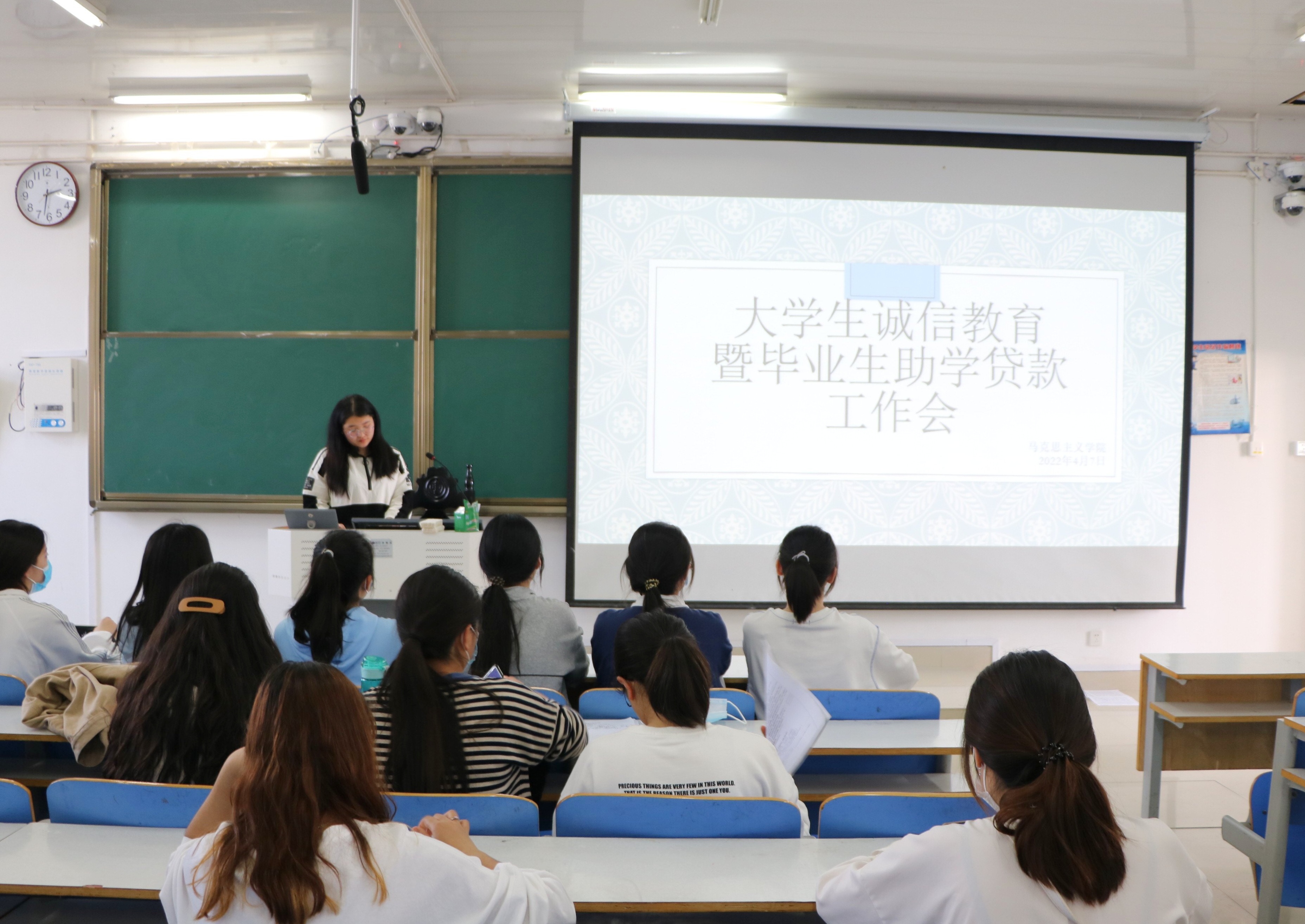 会议伊始,宋佳怡就会议主题“大学生诚信贷款”展开论述,她重点讲述了大学生助学贷款违约的后果以及违约的处理措施,并说明未按时还款将对个人信用形成负面记录,对自身发展产生不利影响,强调大学生应以诚信为第一美德,做到按时还款,不失约违约,坚决遵守贷款合约规定。随后,她为同学们介绍了还款流程,详细讲解了还款时间、还款方式及其他相关事项,并且提醒注意查询还款时间,按照还款流程及时还款。最后,她对国家的助学贷款政策做了进一步的补充说明,其中包括贷款申请条件、申请时间、发放时间等,帮助各位同学对国家贷款资助政策有了更深的了解。
