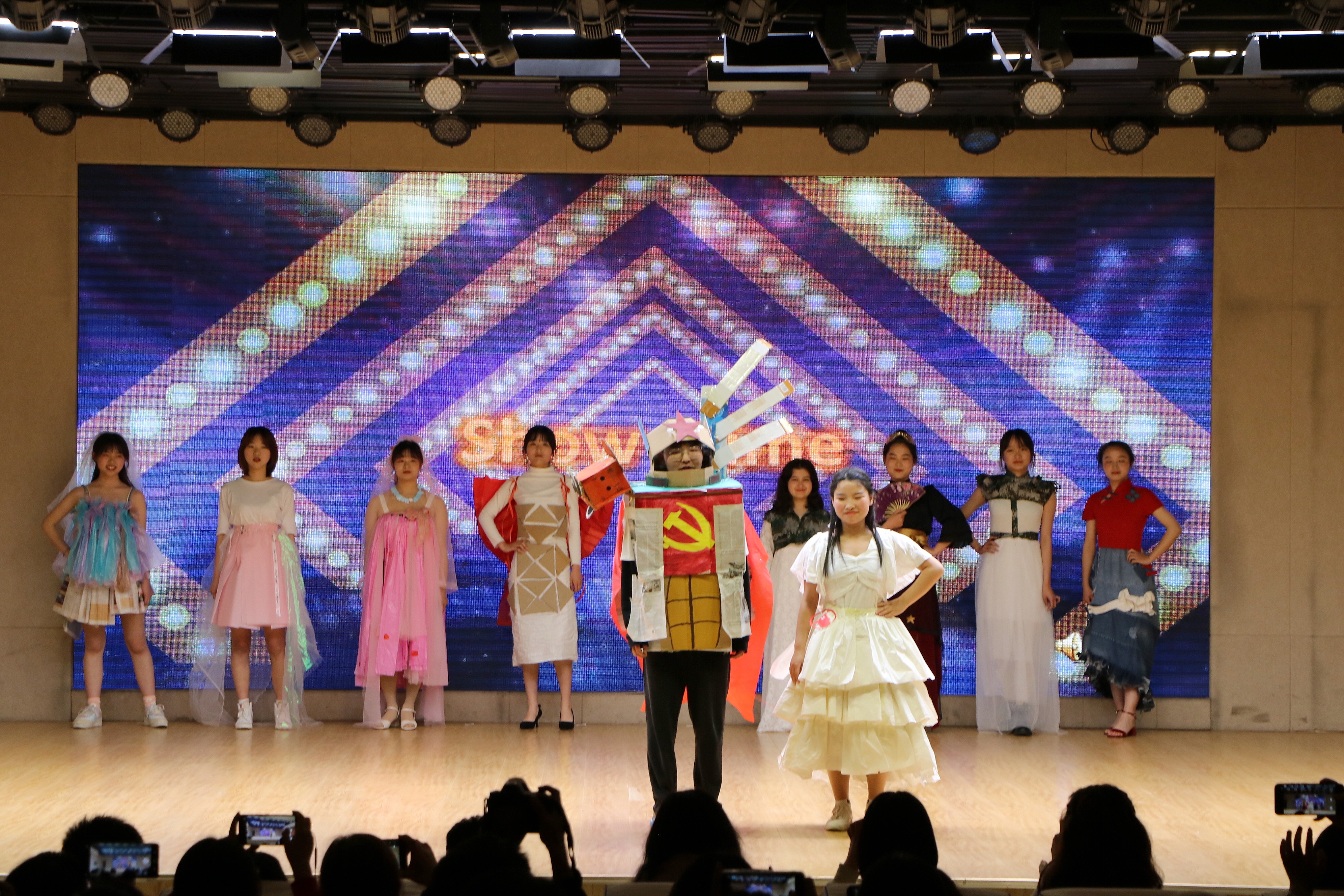 一段活力四射、动感十足的开场舞《HELICOPTER》拉开比赛序幕。经过初赛的角逐,共有10组选手脱颖而出进入决赛。决赛分为轻纱寄红梦、缤纷展春色、裁出新风采、流光衬异彩四个部分。首先,各参赛小组依次上台展示他们独具一格的服装,并介绍服装的创作灵感、设计理念、制作材料和制作过程。其中,第十组秉持绿色环保的设计理念,将废旧的快递盒、布料、报纸等材料变废为宝,制作出服装“天降雄狮”,他们的制作大胆活泼,解说幽默诙谐,现场传来阵阵欢笑。第三组使用废弃布料、丝带制作的服装“红天鹅”,裙摆上的10颗星星象征中国共产党成立100周年,同时将西方芭蕾舞元素和中国红色文化相结合,让人感受到文化碰撞的美感,实现了环保与美感并存,获得各位评委的一致赞赏,最终摘得桂冠。比赛过程中穿插了歌曲、相声和有奖竞答环节,将现场气氛一次次推向高潮。最后,评委老师为各获奖小组颁奖并合影留念。