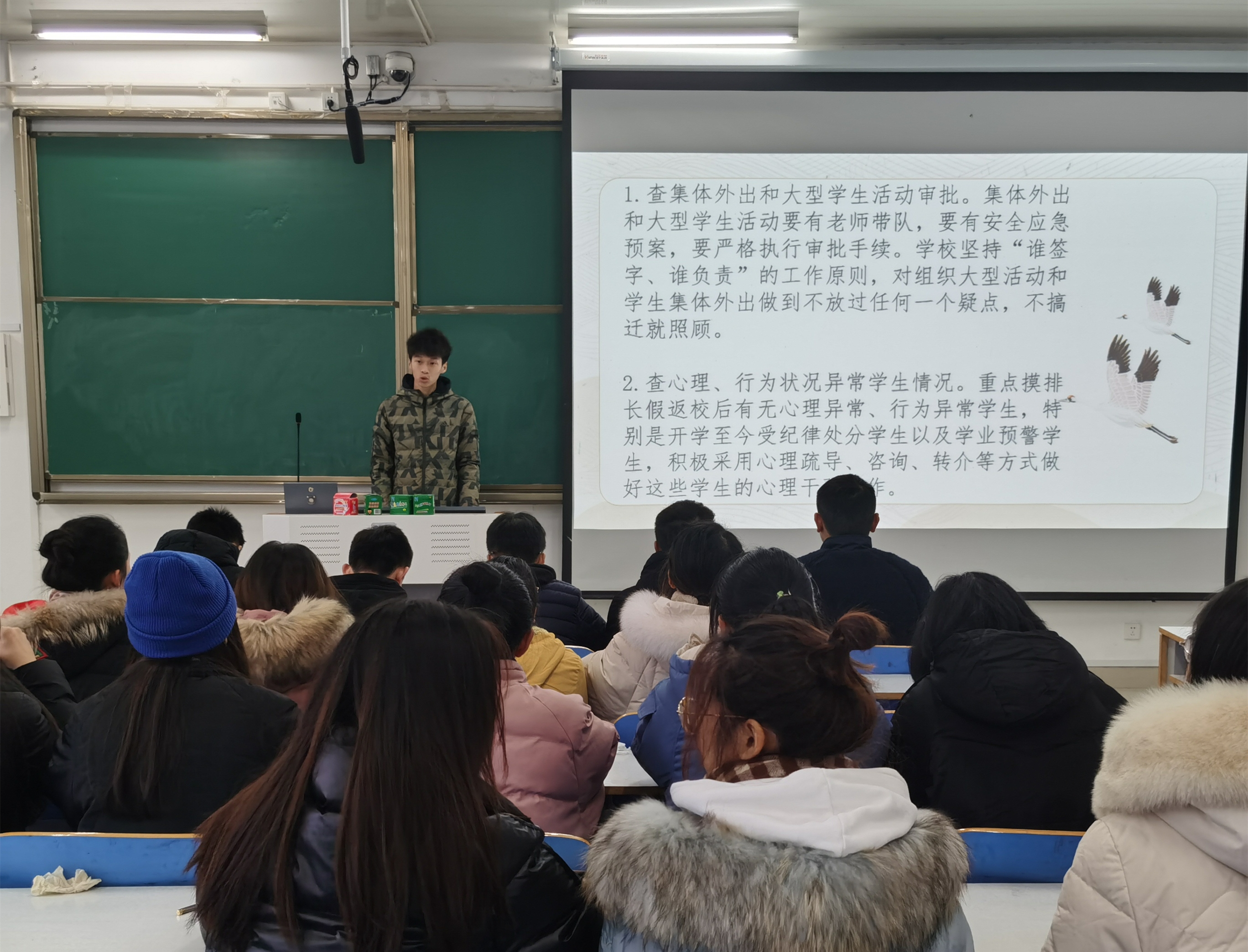会上,班级负责人们向同学们强调校园安全教育的重要性,提醒同学们增强自身安全防范意识,保障个人人身和财产安全。接着,他们通过播放视频、放映PPT等方式,从交通安全、水电安全、防火安全三个方面向同学们介绍了校园安全隐患的具体内容,并提出避免各类校园安全隐患的措施和方法。最后,班级负责人们进行总结,他们表示同学们要自觉遵守校规校纪、宿舍安全管理规章制度,认真学习安全隐患教育知识,牢固树立安全意识,注意校内外交通安全,遵守交通规则,将安全意识内化于心,外化于行。