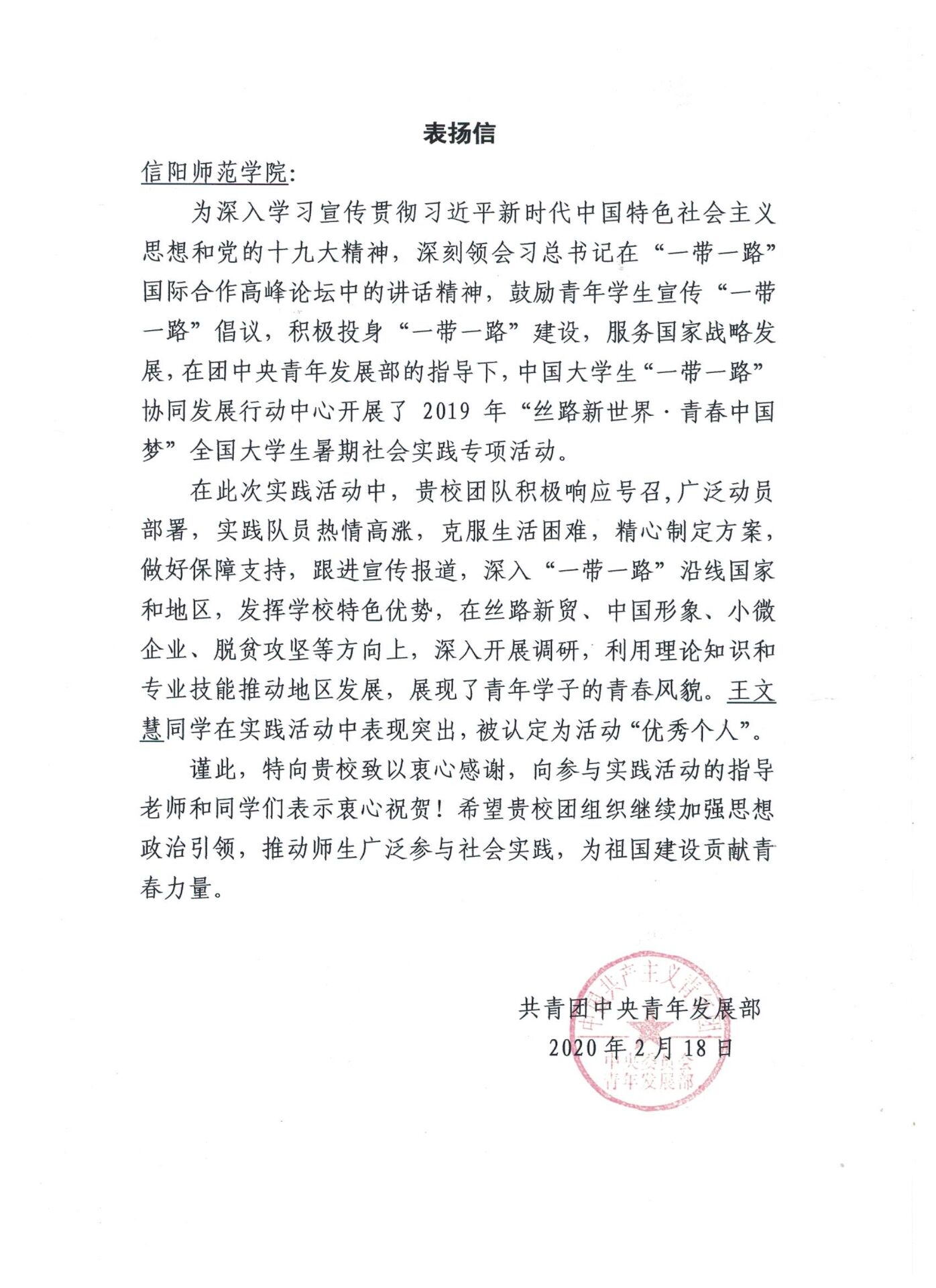 2020年9月21日,WilliamHILL中国收到由共青团中央青年发展部发来的表扬信,信中提及我院积极响应共青团中央的号召,参与由中国大学生“一带一路”协同发展行动中心开展的2019年“丝路新世界·青春中国梦”全国大学生暑期社会实践专项活动,团队队员热情高涨,充分展现WilliamHILL中国学子的青春风貌。
