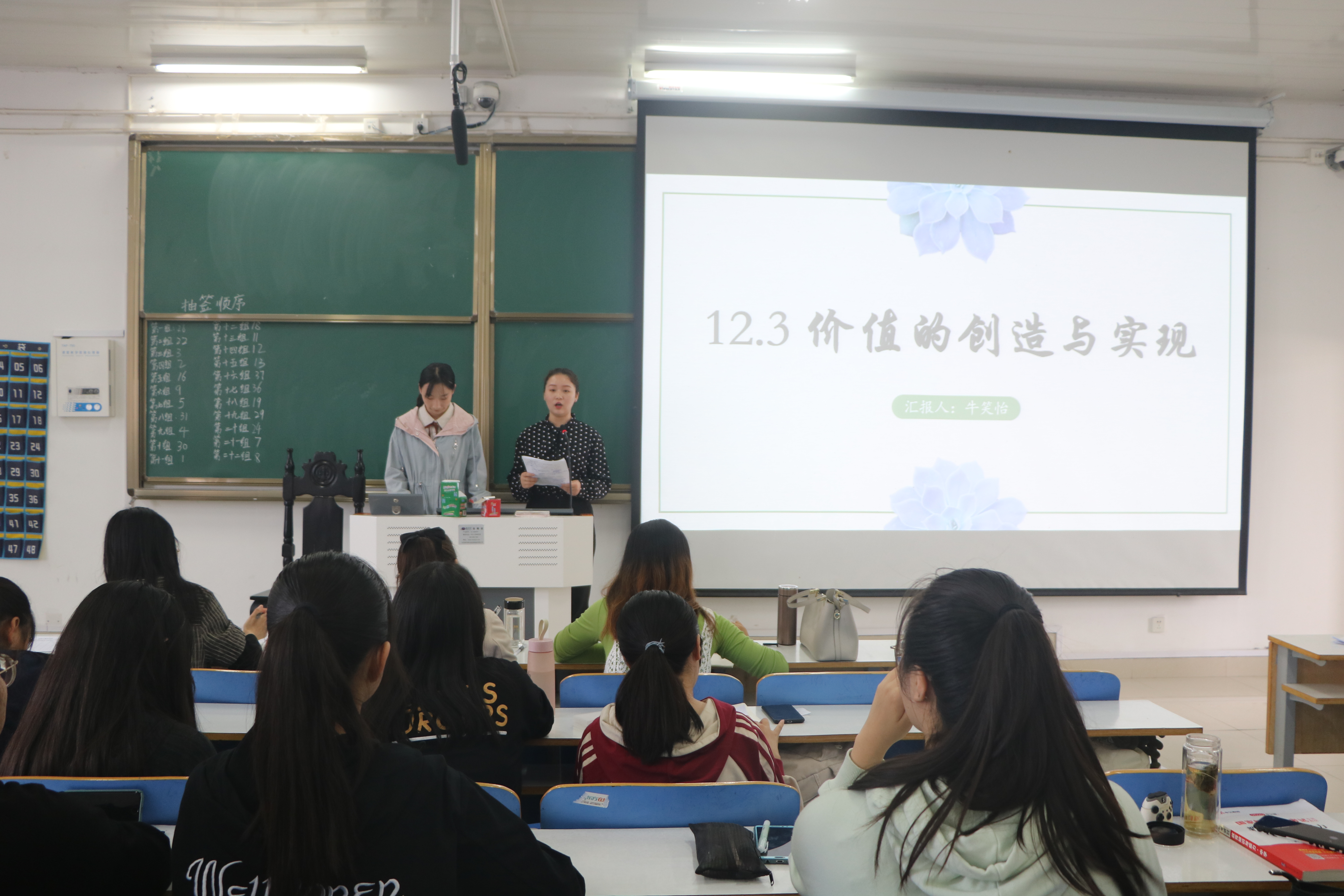 本次说课大赛共有22组选手参加。各参赛选手围绕教材分析、学情分析、教学过程、教学方法、教学板书等方面,通过个人演说与PPT展示相结合的方式阐释了自己的见解。比赛秉持公平、公正、公开的原则,由评委老师对参赛同学说课的内容、过程设计、基本素养进行综合评分。在本次比赛中,各参赛小组准备充分、配合默契、精神饱满,他们用流利的普通话,新颖的教学方法,精心的教学设计,生动的现场展示,赛出了风格,赛出了水平。其中,牛笑怡以“价值的创造与实现”为题进行说课,整体内容丰富、详略得当,教态自然,演讲声情并茂、引人入胜,获得评委一致好评。张靖茹以“和平与发展:当今时代的主题”为题进行说课,内容讲解生动细致,PPT制作精美,图片和视频穿插得恰到好处,让人赏心悦目。经过三个多小时的激烈角逐,最终有15组同学成功进入决赛。