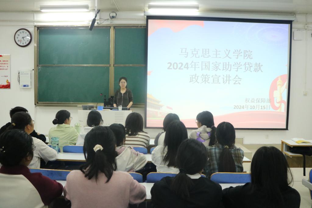 会议伊始,高小佳老师讲解国家助学贷款的相关政策,并向同学们简单普及金融和征信知识。她强调,助学贷款是国家对贫困学子实行的一种经济援助,彰显党和国家对青年学子的人文关怀,同学们应当积极配合学校开展的助学贷款工作,严格遵循办理流程,做到诚信贷款、自觉还款。