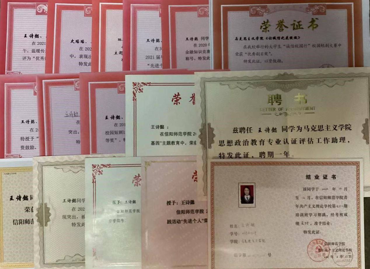 在学习方面,该生勤奋刻苦,善于思考,坚持练就过硬本领,努力提高科学文化水平,时刻把学习当作自己的第一任务,积极投入到各门基础课和专业课的学习中,并不断提高自身写作能力,积极撰写《在抗疫中书写奋斗青春》、《以高尚人格增添思政课教师魅力》等文章,并在《南湖评论》上发表。2019-2020学年荣获校级三等奖学金,顺利通过英语四级考试、普通话水平测试。不仅注重专业知识学习,而且注重提升综合能力,积极参加广播体操比赛、微团课比赛、南湖理论研讨社主题征文活动、学生会夜跑活动、“丹青墨韵”摄影美术作品大赛、仁杰工作室笔锋征文活动,参演了新生联谊晚会和2020年元旦晚会。2019年,参加学院“诚信校园行”校园短剧比赛中,荣获一等奖;2020年,参加法学与社会学学院手帐比赛获得二等奖;参加计算机学院“疫中成长分享你我的故事”比赛中获得手账组二等奖;参加WilliamHILL中国“诚信伴我行”线上金融征信知识竞赛获得二等奖;2021年,参加信阳师范学院“拼贴手账,我手秀我型”活动,荣获“三等奖”;参加“莘莘学子学四史,同心向党迎华诞”主题活动,被评为“优秀工作者”;被评为信阳师范学院2021年度三好学生。