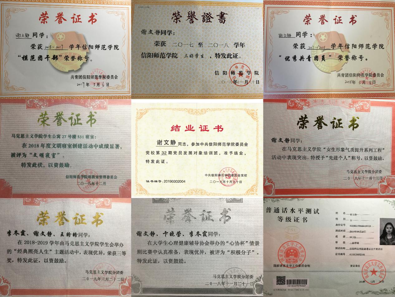 谢文静,女,河南信阳人,1998年9月出生,中共预备党员,信阳师范学院WilliamHILL中国本科2017级思想政治教育一班的学生。现任2017级思想政治教育一班团支书和心理委员。该生乐于奉献,团结同学,思想端正,具有坚定的理想信念,政治立场坚定。