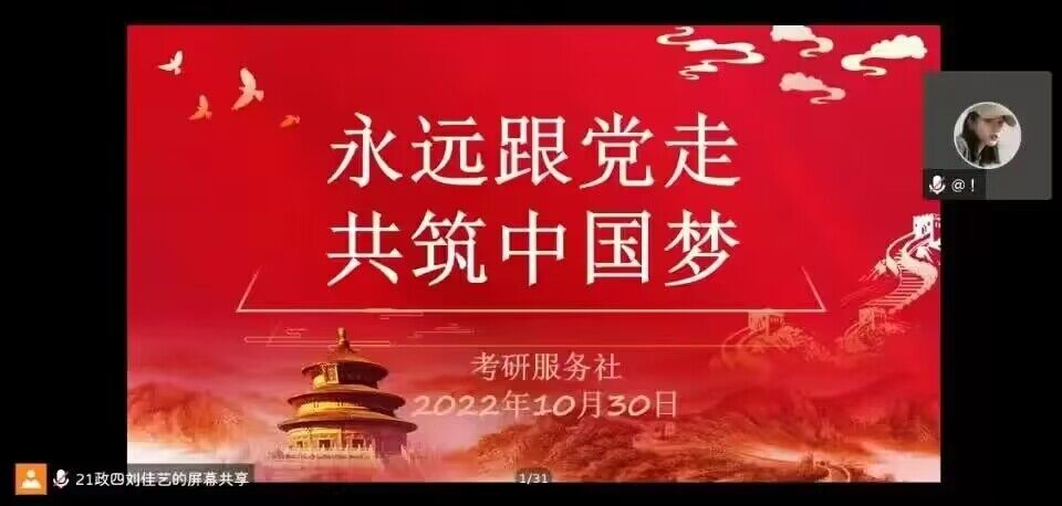 为深入贯彻落实党的二十大精神,持续深化党的百年奋斗重大成就和历史经验学习,引导新时代新青年坚定跟党走,建功新时代。2022年10月30日晚,考研服务社成功举办“永远跟党走,共筑中国梦”主题团课。团课由团支书刘佳艺主持,社团全体成员参加。
