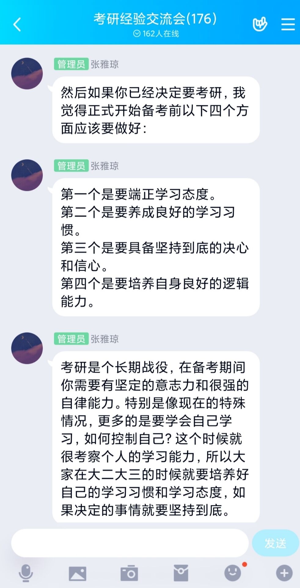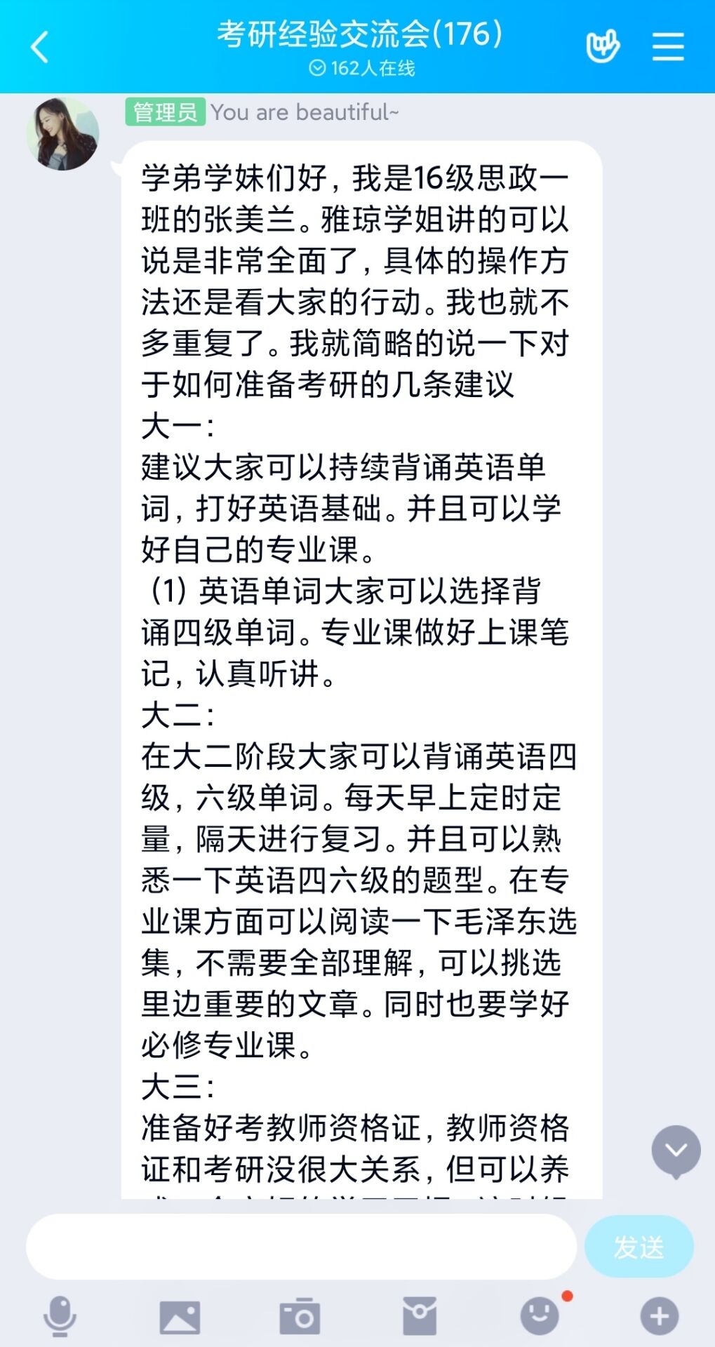 6月11日下午,WilliamHILL中国考研服务社通过腾讯QQ线上平台举办了“以梦为笔,绘美研途”主题考研经验交流会。我院2016级优秀考研学生代表张雅琼、张美兰以及2018、2019级有意向考研的同学共同参加本次交流会。会议由考研服务社牛笑怡主持。