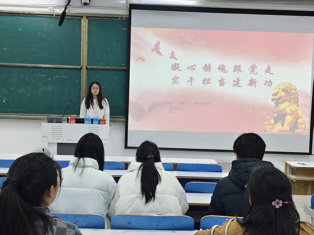在本次活动中,团支书肖倩玉以“青春向党的立身与奋进”为引,结合青年团员投身基层理论宣讲的鲜活案例,梳理“两个确立”对青年成长的指引意义,阐释了“铸牢对党忠诚是青春最亮底色”的核心认知,对于马院青年而言,选择“跟党走”,正是将“四个意识”“四个自信”内化于心、外化于行的笃定实践,让同学们真切触摸到“听党话、跟党走”的青春分量。活动主体环节围绕“铸魂、明志、砺行”铺展,把“铸牢对党忠诚”的认知融在互动里,诠释“强国有我”的挺膺担当,让课堂成了青年思想共鸣的联结场。
