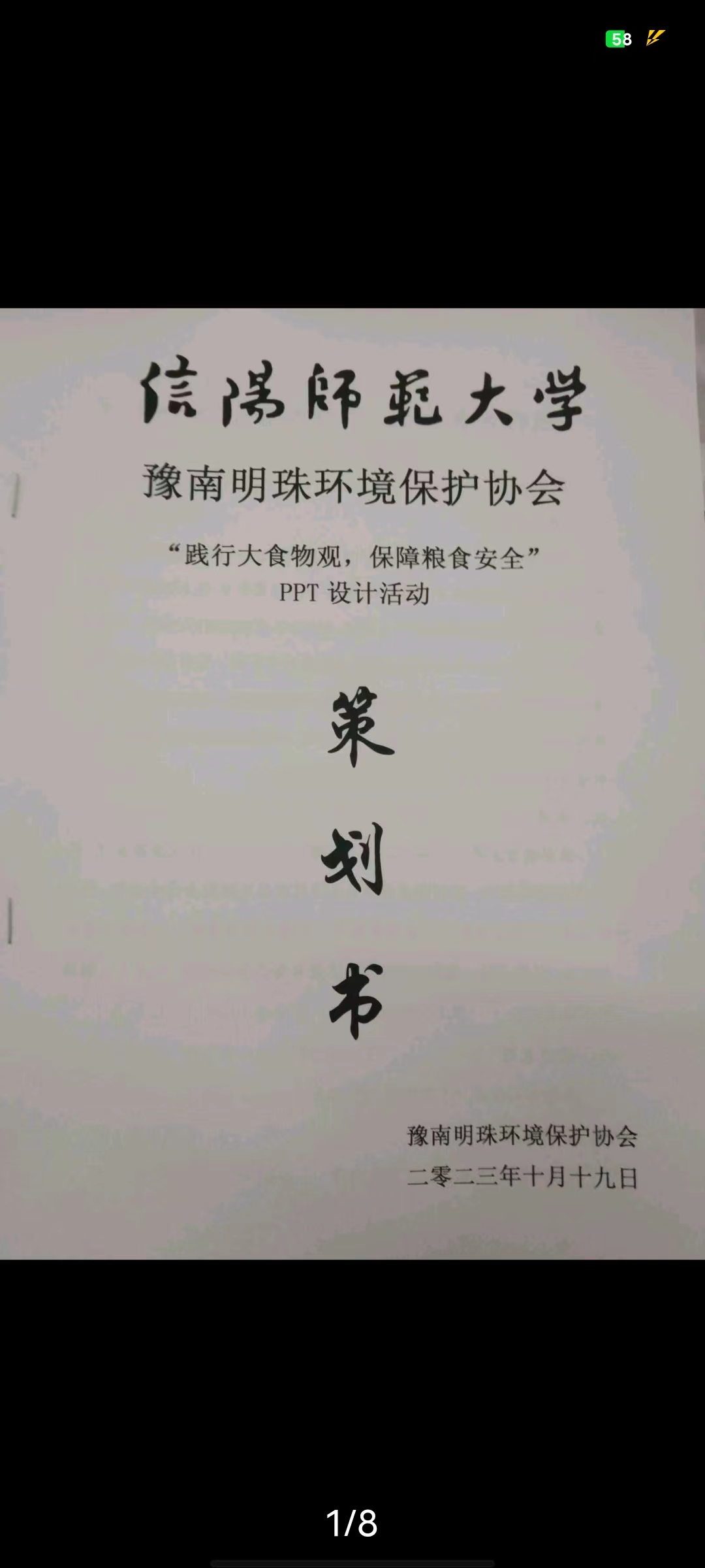 粮食安全是“国之大者”。习近平总书记指出:“保障粮食和重要农产品稳定安全供给始终是建设农业强国的头等大事。”为进一步宣传粮食安全问题,让每位学生充分了解保障国家粮食安全的重要性,10月27日至30日,豫南明珠环境保护协会举办“践行大食物观,保障粮食安全”PPT设计活动。