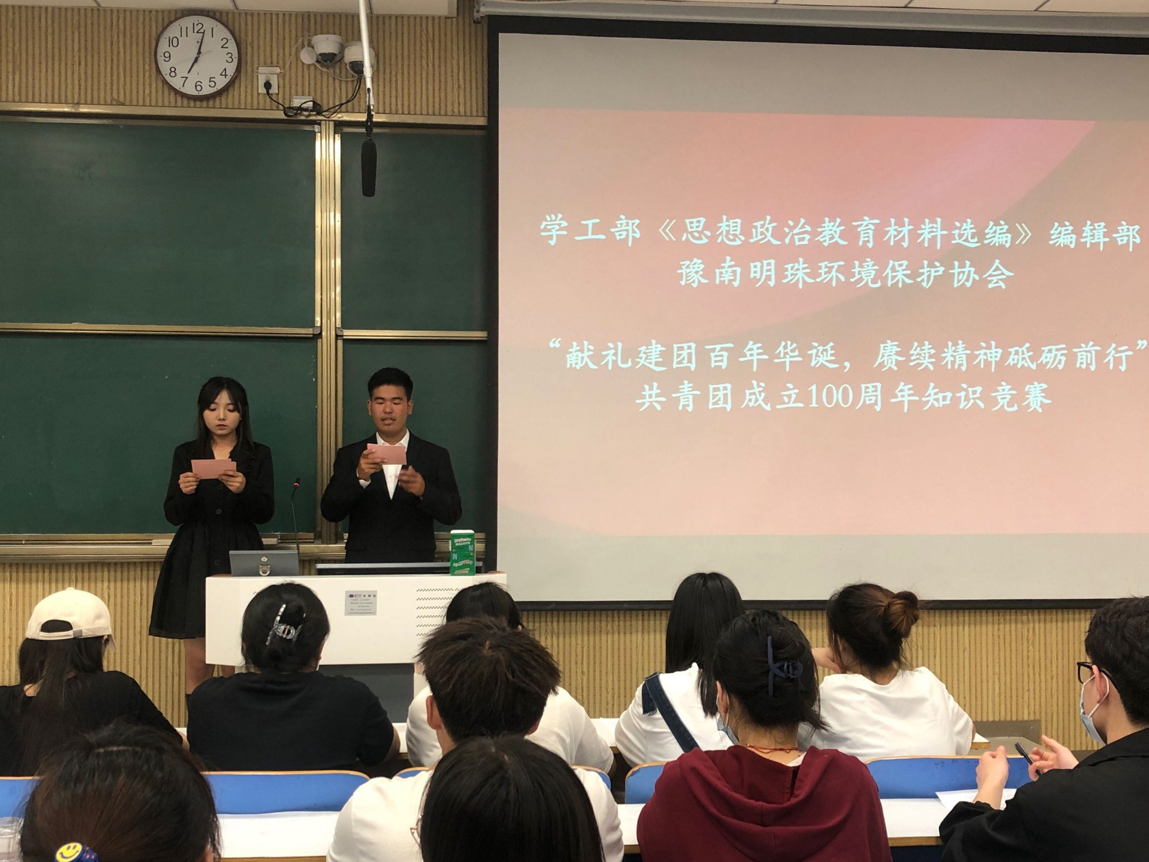 风雨洗礼,岁月迁延。为庆祝共青团成立100周年,学工部《思想政治教育材料选编》编辑部联合豫南明珠环境保护协会于2022年5月7日晚在社科楼举办“献礼建团百年华诞,赓续精神砥砺前行”共青团成立100周年知识竞赛。学生会主席团成员及各部长出席本次活动。活动由姜开丹和王蒙主持。