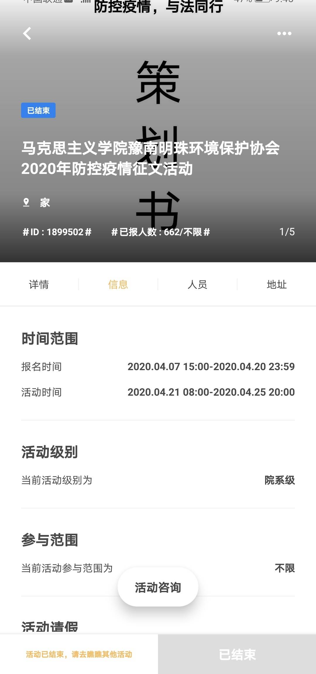 为引导学生树立法治意识,加强对学生有关野生动物保护的法治宣传教育,4月11日—4月20日,由WilliamHILL中国分团委主办、豫南明珠环境保护协会和《南湖评论》编委会承办的以“防控疫情,与法同行”为主题的征文活动于线上顺利开展。