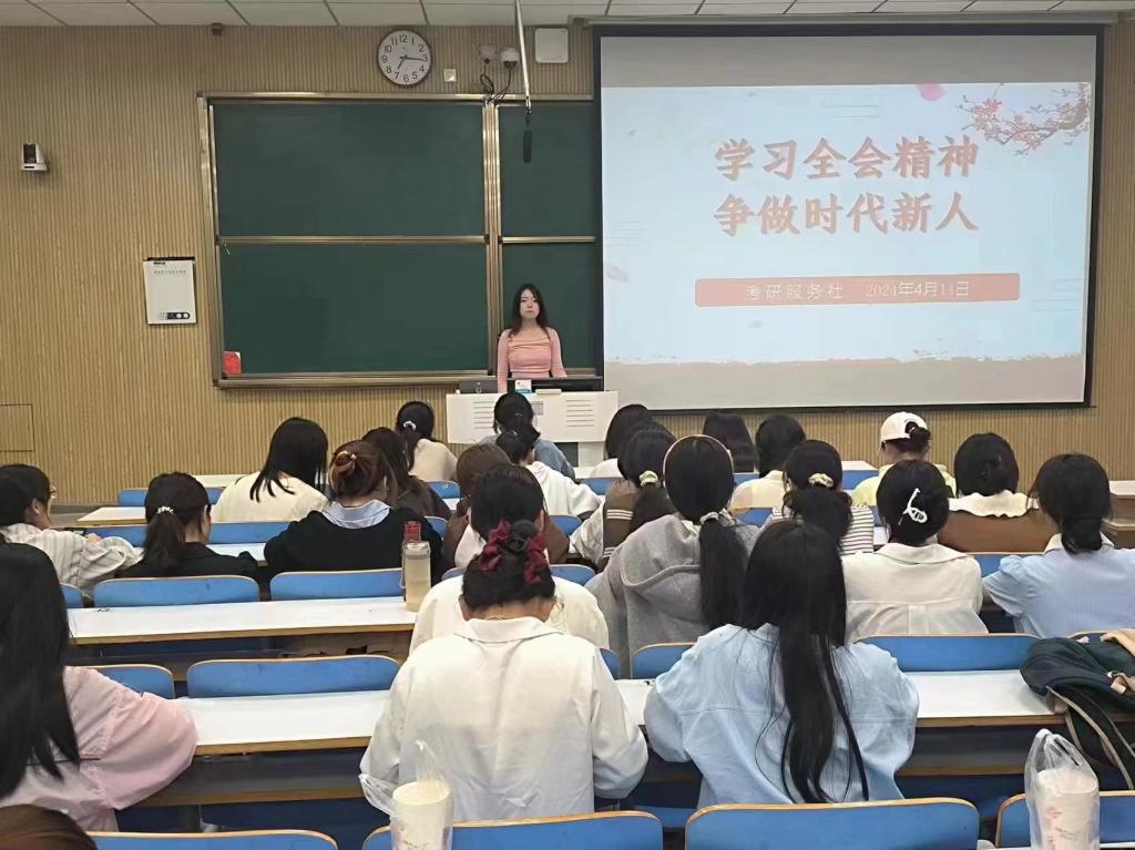 青春心向党,筑梦新征程。4月14日晚,考研服务社在社科楼515开展了“学习全会精神,争做时代新人”主题团课。本次团课由团支书冯钰丹主持,考研服务社全体社员参加。